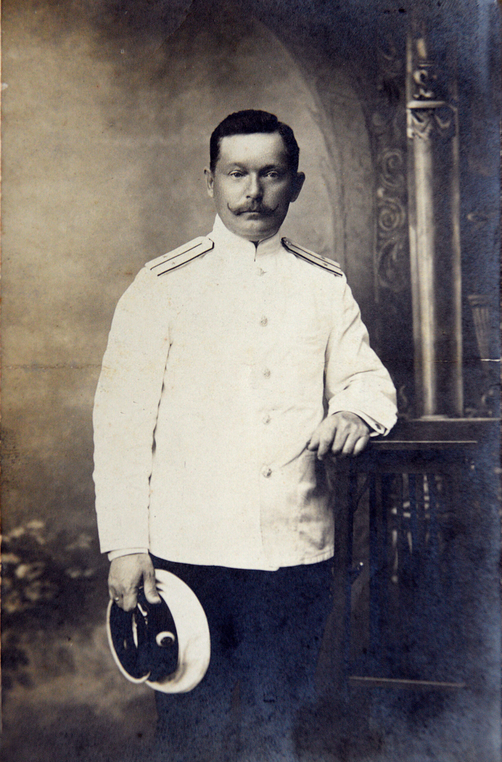 Призван из запаса по мобилизации и зачислен в Сибирскую флотскую экипажу 30.01.1904. Инструктор в классе судовых содержателей Сибирской флотской экипажи 28.01–1.08.1905. Назначен в Сибирский нестроевой полуэкипаж 1.08.1905. Произведен в кондукторы старших баталеров 20.06.1905. Уволен от службы по домашним обстоятельствам 17.11.1905. Вновь определен на действительную службу 8.02.1911. Старший баталер на КР «Жемчуг» 3.03.1911–15.10.1914. После гибели КР «Жемчуг» 15.10.1914 в бухте Пенанг (потоплен германским КР «Эмден») прибыл во Владивосток на ВКР «Орел» 4.12.1914. Старший баталер при штабе Командующего Сибирской флотилией 8.12.1914–7.10.1915. Произведен в подпоручики по адмиралтейству 5.10.1915. Состоял при штабе командующего Сибирской флотилией 7.10–16.11.1915. Назначен в дивизион подводных лодок Сибирской флотилии 16.11.1915. Вахтенный начальник ПЛ «Дельфин» 17.11.1915–1.03.1917. Преподаватель общеобразовательных предметов дополнительных вечерних занятий в Школе специалистов Сибирской флотилии 10.11.1915–16.02.1916, с оставлением в занимаемой должности.