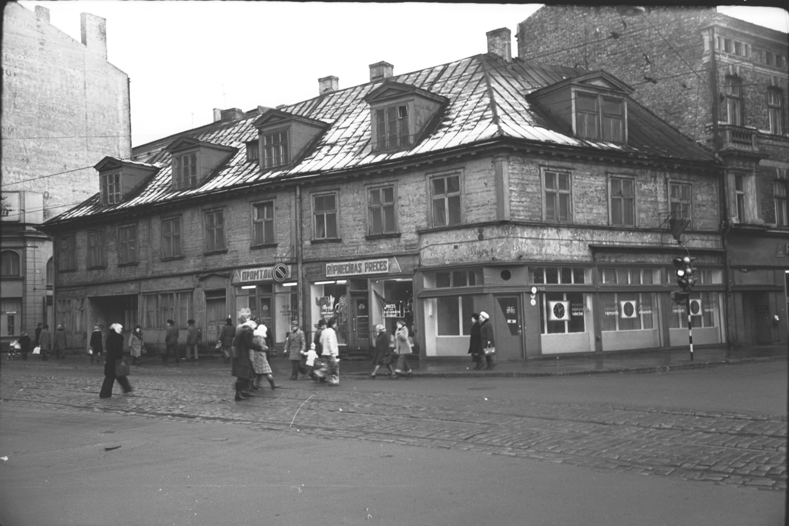 Фото 1970-х років перед знесенням будинку. Знизу напис “Промтовари”