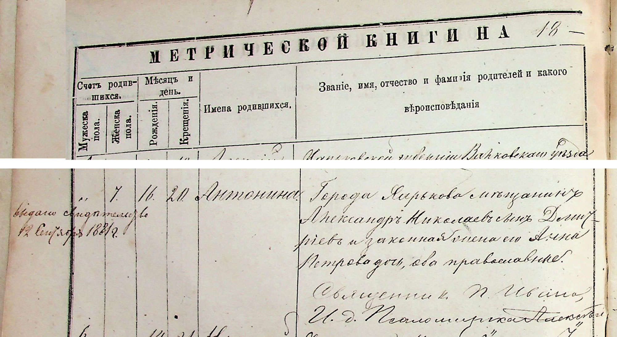 Тьотя нашої бабусі, Антоніна Дмитрієва народилася у Харкові у родині Харківського міщанина 16 лютого 1881 року. Хрестили у Миколаївській церкві Харкова 20 лютого 1881 року. Видано Свідоцтво о народженні 12 вересня 1881 року.