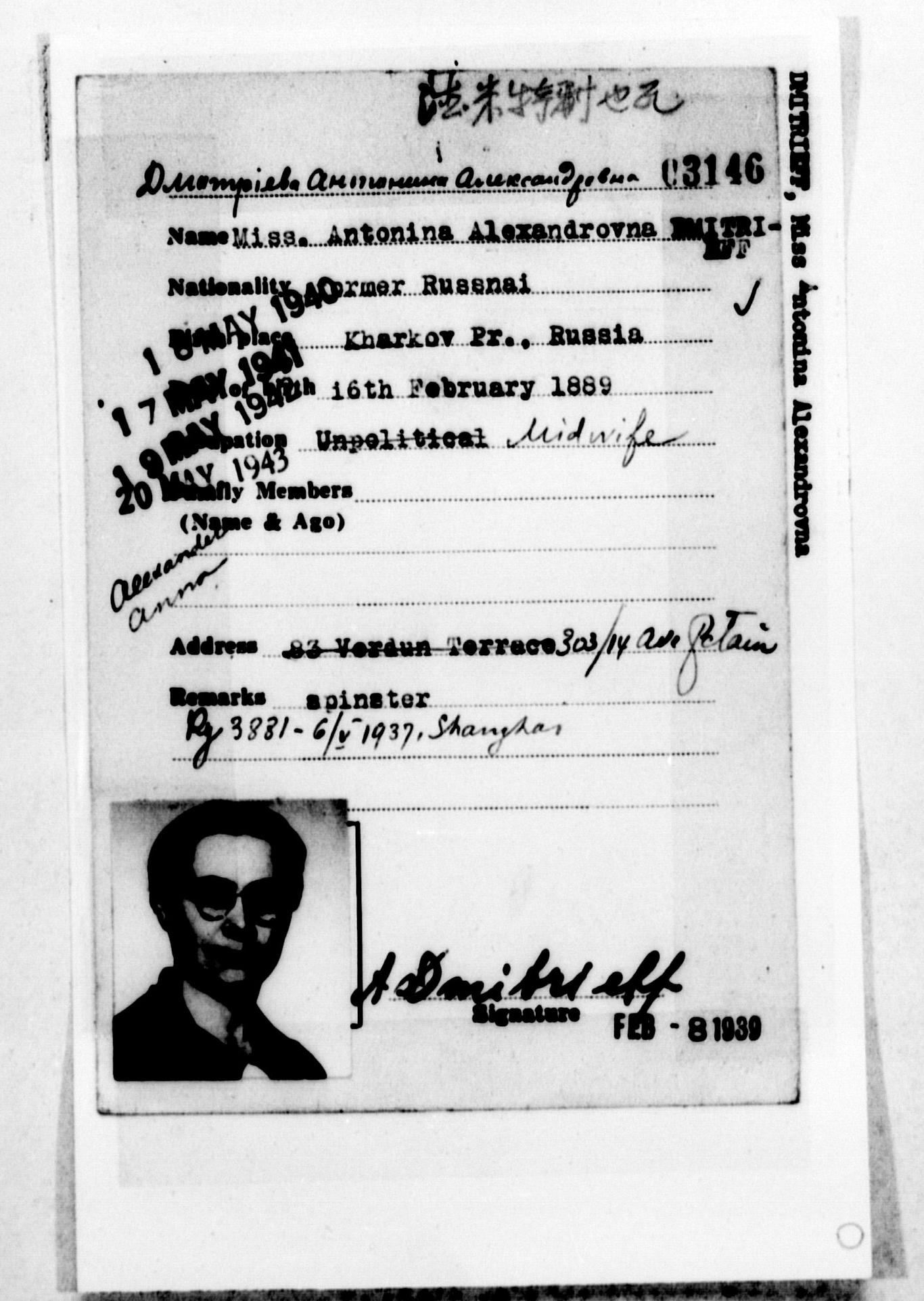 Посвідчення особи, видане японською адміністрацією Маньчжурі. 満洲国也 [ Манчжоу-го — «Маньчжурская держава»]. №03146 / Miss. Antonina Alexandrovna Dmitrieff, 1937-1940.